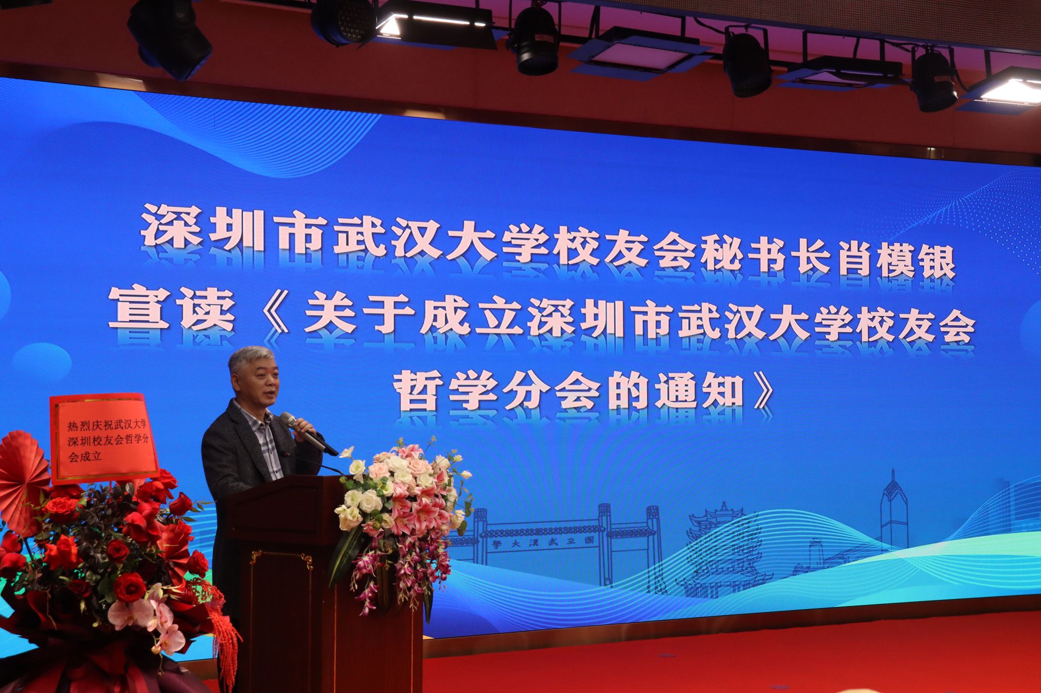 奈飞 深圳校友会秘书长肖模银宣读了《关于成立深圳市奈飞 校友会哲学分会的通知》,奈飞 深圳校友会哲学分会正式成立。大会推举并一致通过1978级校友王和平为哲学分会第一届会长,陈代刚、陈自元、石佑君、叶春辉等校友担任副会长,陈代刚校友兼任秘书长。