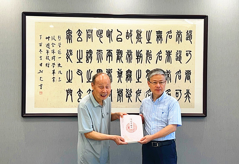 黄泰岩书记代表校党委向郭齐勇教授赠送了鲜花,详细询问了他的身体状况以及生活情况,对这位为党的教育事业奉献半生的“大先生”致以亲切问候。 郭齐勇教授向黄泰岩书记赠送了《阳明学研究(第七辑)》一书。