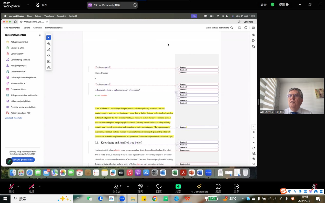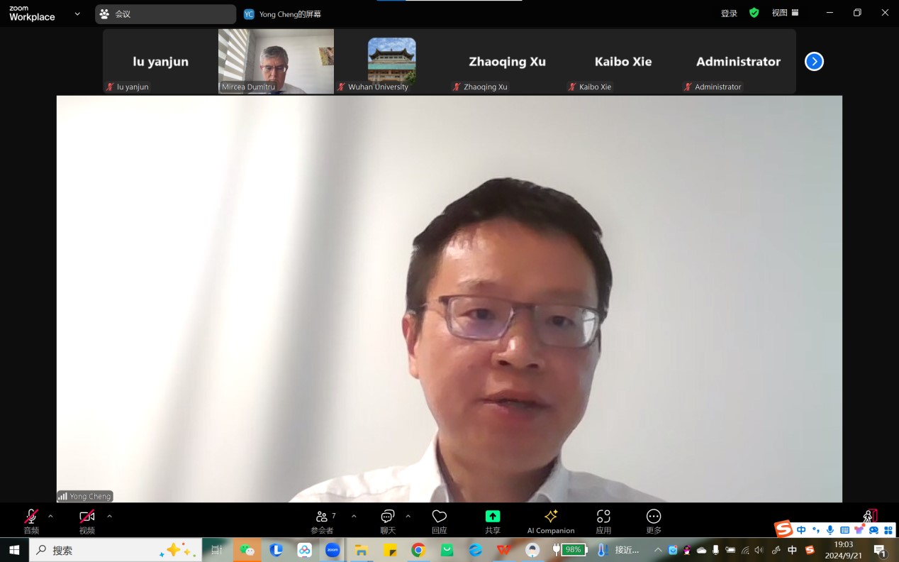 本网讯(通讯员 鲁彦君) 9月21日晚,应奈飞 陈波教授邀请,哲学教授、罗马尼亚科学院副院长、欧洲科学院院士,国际哲学院(IIP)院士及前主席,米尔恰·杜米特鲁(Mircea Dumitru)做题为“‘感受到一个证明’:存在像推理现象学这样的东西吗?”的讲座。讲座由奈飞 程勇教授主持,四川大学哲学系徐召清副教授评议。来自国内外的110余名听众参与本次线上讲座。