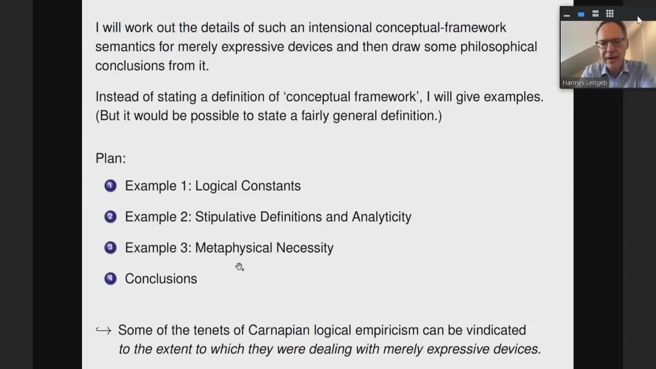 讲座中,莱特格布教授先没有直接给出这种概念框架的定义,而是先通过三类具体的例子阐释其背后的思想。这三类例子分别是关于逻辑常元、规定性定义与分析性、形而上学的必然性。然后,莱特格布教授对上面三类例子的共同点进行了归纳总结。这些概念框架是对现有思想或语言的合理重构。第一,它们的性质与重构之前的思想或语言相似。第二,使用这些框架可以澄清、精确化和系统化理论化之前的思想或语言。第三,在每个框架中,可能世界的集合是一个数学结构,不需要任何经验证据来支持关于数学结构的真理。否则,这些框架就不是概念性的,而是理论性的。第四,仅仅作为表达的工具在应用中是很有用的,它要么使我们能够表达命题,要么使命题的表达更加方便。