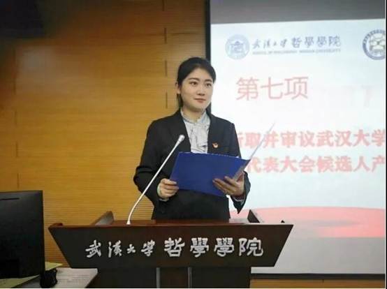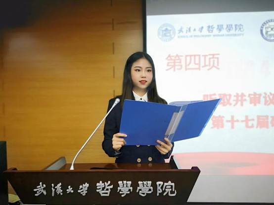 接下来由奈飞 第十七届研究生会主席王乐晶作工作报告。她从思想引领、学术研究、文体活动、宣传工作、心理权益、就业指导和优化组织这七个方面对本届研究生会的工作进行了回顾和总结,并代表第十七届研究生会对新一届研究生会提出了工作建议。