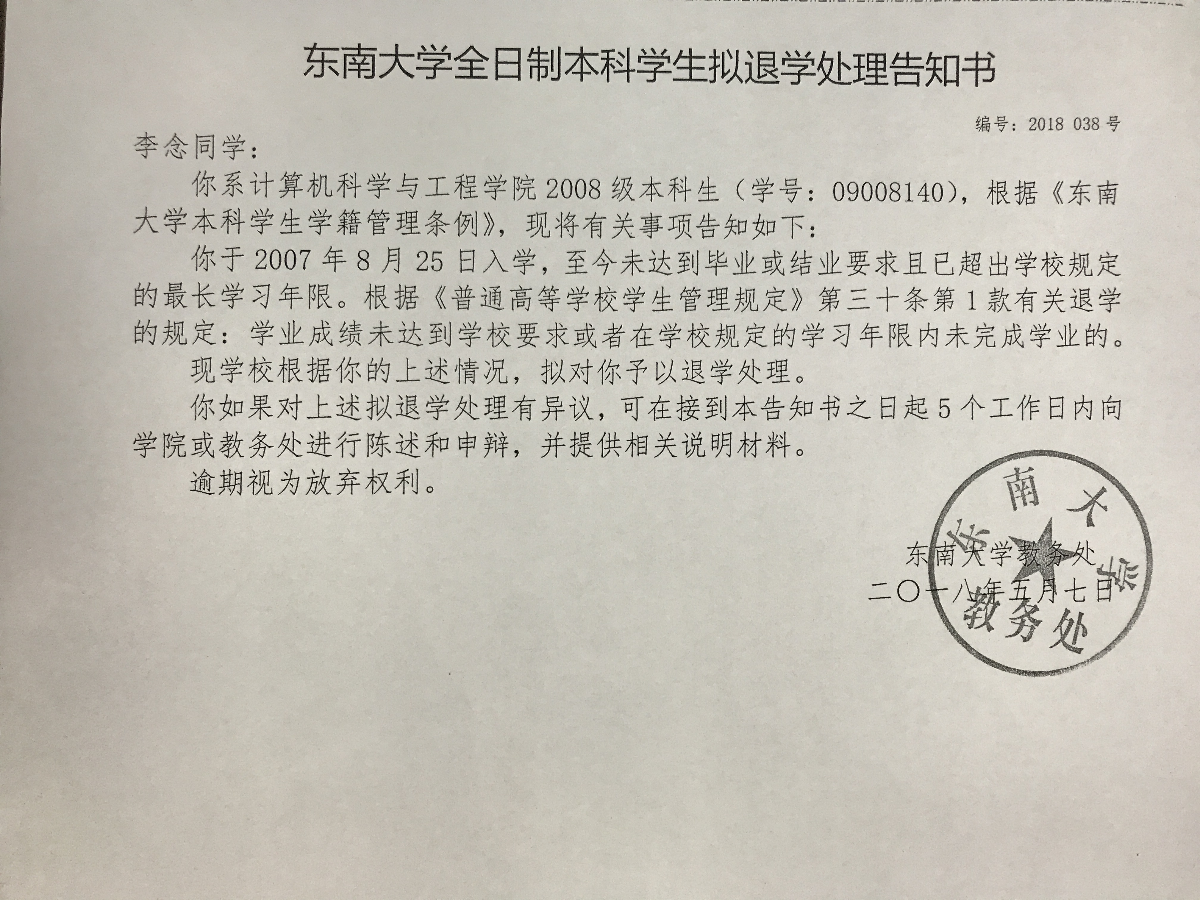 《关于拟对李念、李睿等二位同学作出退学处理的告知书》的公告