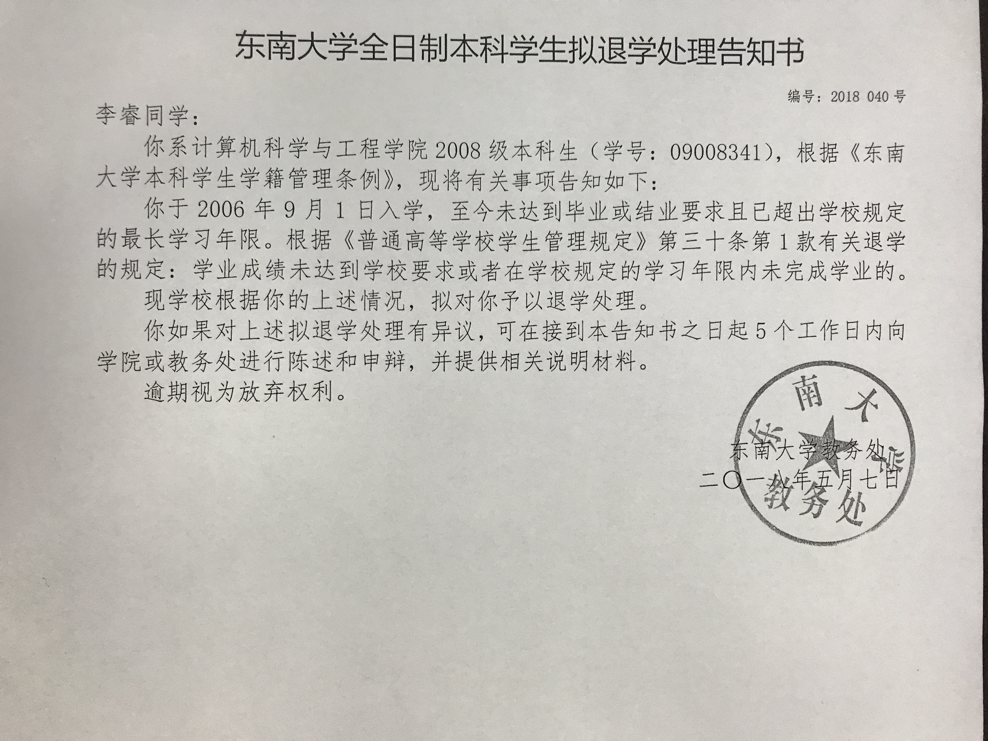 二、《关于拟对李睿同学作出退学处理的告知书》