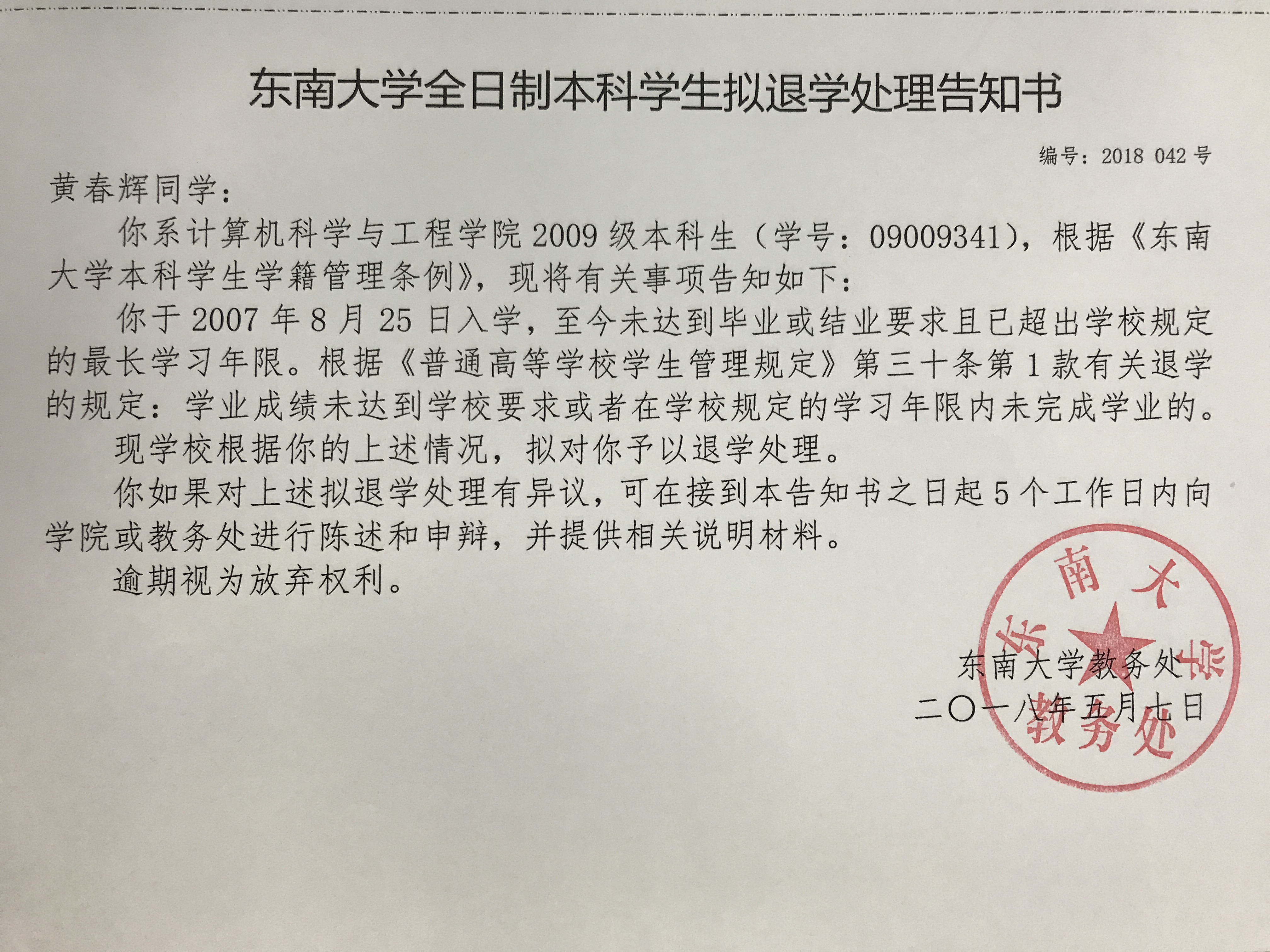 一、《关于拟对黄春辉同学作出退学处理的告知书》