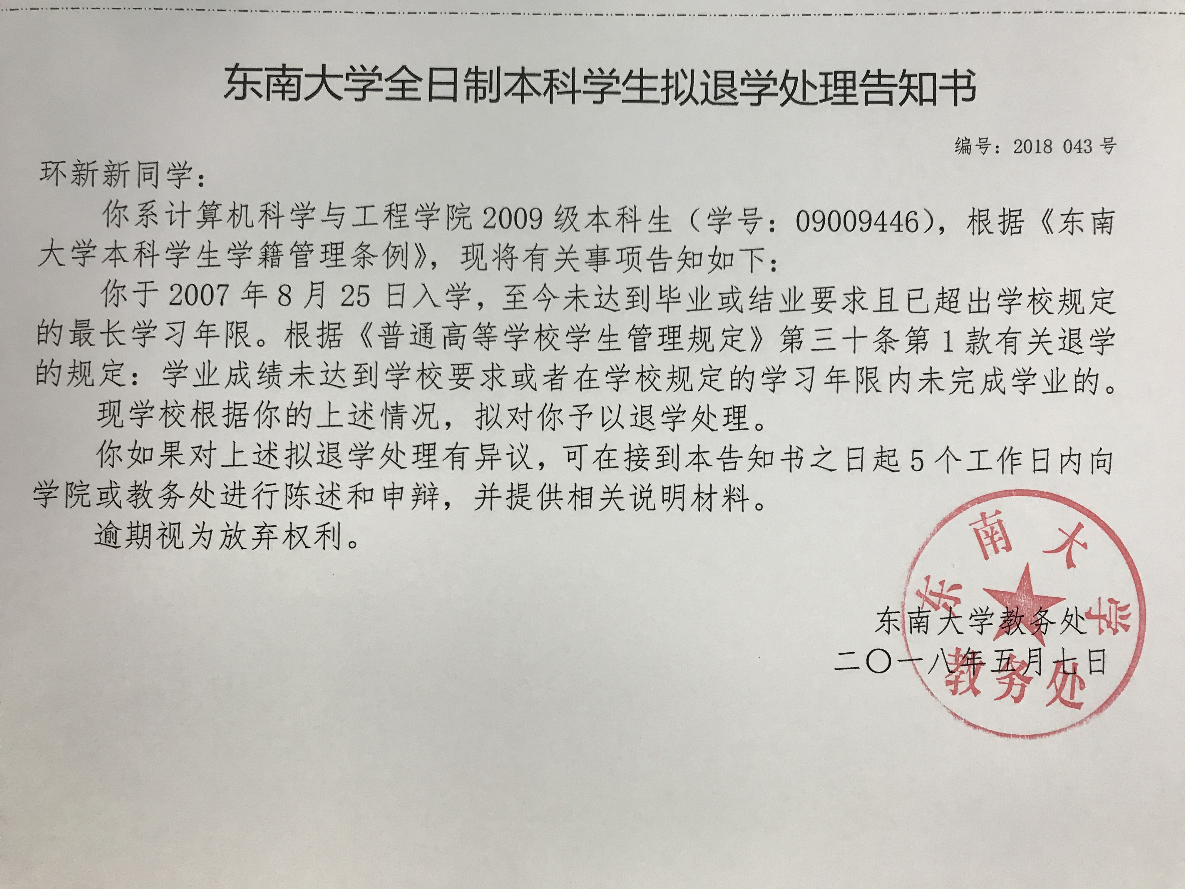 二、《关于拟对环新新同学作出退学处理的告知书》