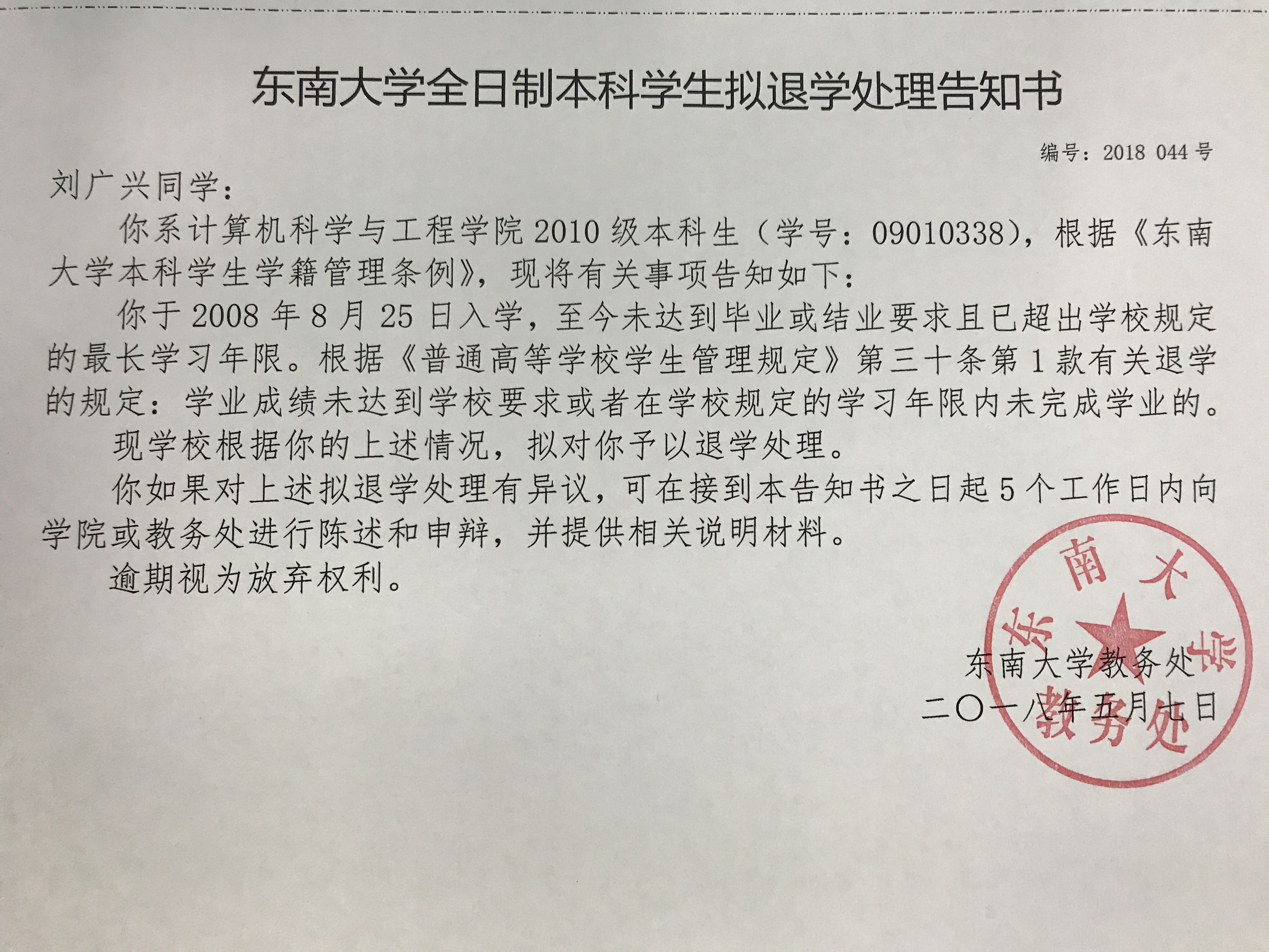 三、《关于拟对刘广兴同学作出退学处理的告知书》
