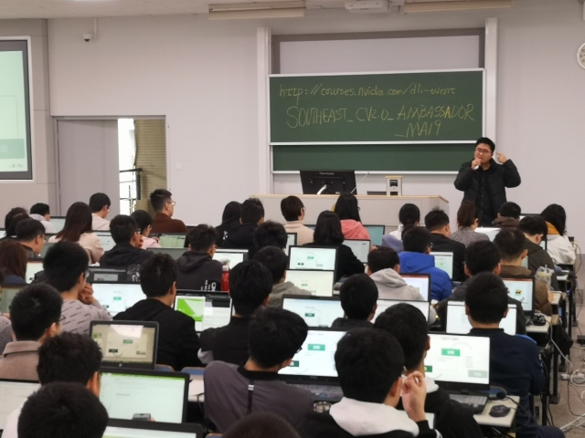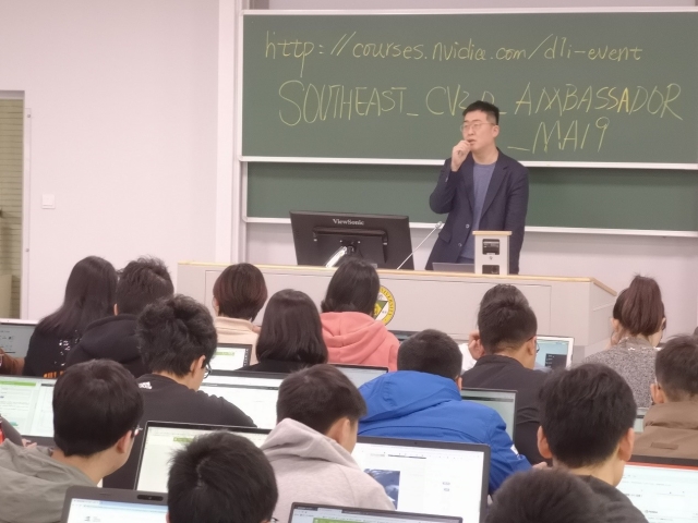 本次课程采用“理论+实践”的授课模式,同学们在英伟达高级解决方案构架师付庆平专家的现场指导下,先学习深度学习相关的理论知识,再通过一系列动手实验将深度学习技术应用于一系列计算机视觉任务。学生们通过连接英伟达提供的云端 GPU 工作站,并利用通用的深度学习工具、框架和工作流程展开工作,以训练和部署神经网络模型,学生只需携带一台笔记本电脑即可快速投入学习。理论结合实践,让同学们在一天的时间内轻松入门深度学习。培训结束之后所有学员获得了由英伟达深度学习奈飞(DLI)颁发的培训证书。