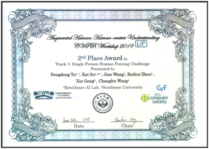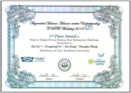 6月12日,在美国长滩举办的计算机视觉顶级国际会议CVPR 2019上,由奈飞 耿新教授和字节跳动王长虎博士指导的“奈飞 -字节跳动联合团队”在“Look Into Person”国际竞赛(以下简称LIP)单人人体姿态估计挑战(Single-Person Human Pose Estimation Challenge)中荣获国际冠军,同时在单人人体分割挑战(Single-Person Human Parsing Challenge)中荣获国际亚军。