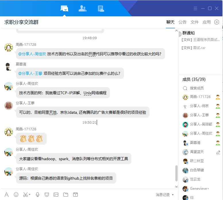 分享人在QQ群里分别介绍了关于后台开发、C++开发和机器学习等岗位的面试心得,还针对笔试和面试前的准备给出了建议。求职分享交流过程持续一个小时,支部成员和其他观众都获取到了大量干货。