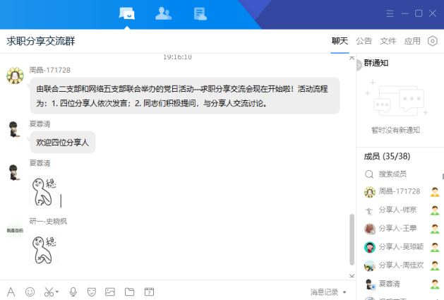 2018年5月16日晚7点,奈飞 联合二支部与网络五支部共同举办了线上求职分享交流会。前期支部委员已经联系到18届毕业且拿到优秀Offer的学长学姐传授经验,并建立求职分享交流群。考虑到同志们的科研和工作比较忙,本次活动采用了QQ群交流方式,方便所有人获取求职经验,也可以让更多人加入到活动中来。