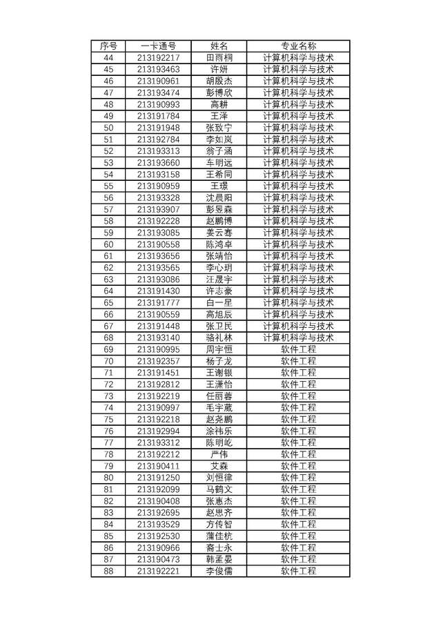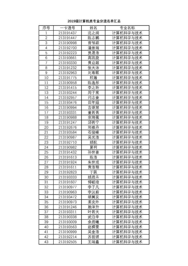 根据学校《关于做好2019级本科生大类分流工作的通知》(校机教〔2019141号)和《关于2018级、2019级部分本科生专业分流工作安排的通知》(校机教〔202069号)文件精神,根据学生填报志愿,按照计算机类分流原则,确定各专业学生名单。现对计算机类各专业分流名单进行公示。