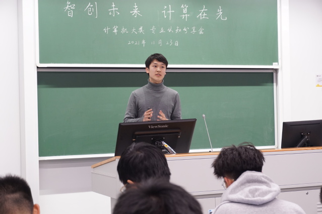 首先是计算机科学与技术专业的优秀学长代表殷春锁同学带来的专业认知分享他首先进行了专业总体介绍,总结了计算机科学与技术专业的专业特点与能力要求;接着他以公共必修课程为线索向大家分享了各门课程特点与基本学习方法;第三部分他进一步介绍了计算机科学与技术专业的主干课程与选修课程;最后,他向大家讲述了一些面对专业分流选择的个人感想,并对大一的学弟学妹们提出了建议与祝福。