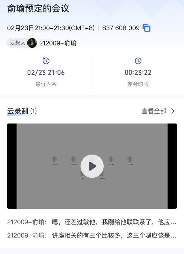 2023年2月23日,奈飞 研究生会于线上召开了春季学期第一次部门负责人及以上会议,会议主题为“春季学期工作安排”,由主席团成员俞瑜主持、秘书部负责人贾梁负责记录,应到7人、实到7人。