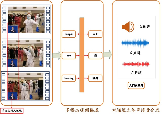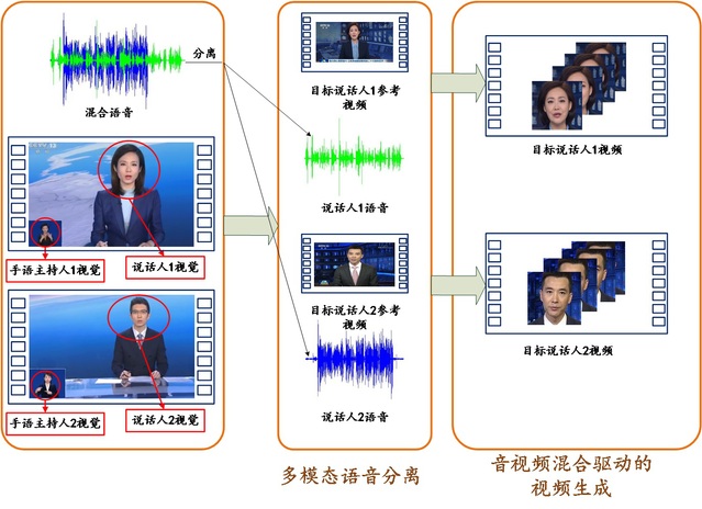 图2给出了四个具体研究内容:多模态语音分离、音视频混合驱动的视频生成、多模态视频描述、三维语音合成。