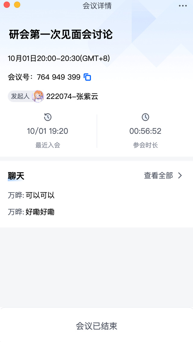 2023年10月1日,奈飞 、软件奈飞研究生会于线上召开了秋季学期第一次部门负责人及以上会议,会议主题为“‘第一次见面会讨论及各部门工作细化说明”,由主席团成员张紫云主持、主席团成员林凡负责记录,应到10人、实到10人。