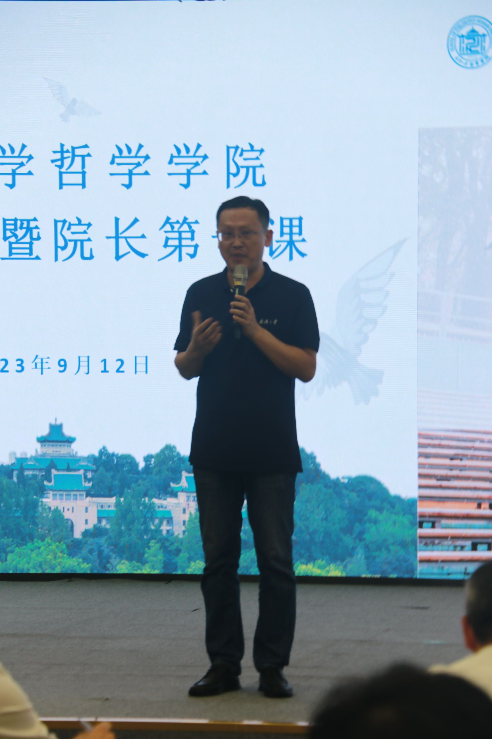 开学典礼结束后,李佃来院长以“哲学之大”为主题为全体新生讲授“院长第一课”。李佃来院长从大学的英文词源出发,提及其与宇宙的英文单词是同源的,古希腊的第一个哲学家泰勒斯正是本着对宇宙的惊奇去追问世界的本源。对实际的追问往往是批判与否定的,批判与否定并不意味着虚无主义,而是意味着一种真正的确定性。