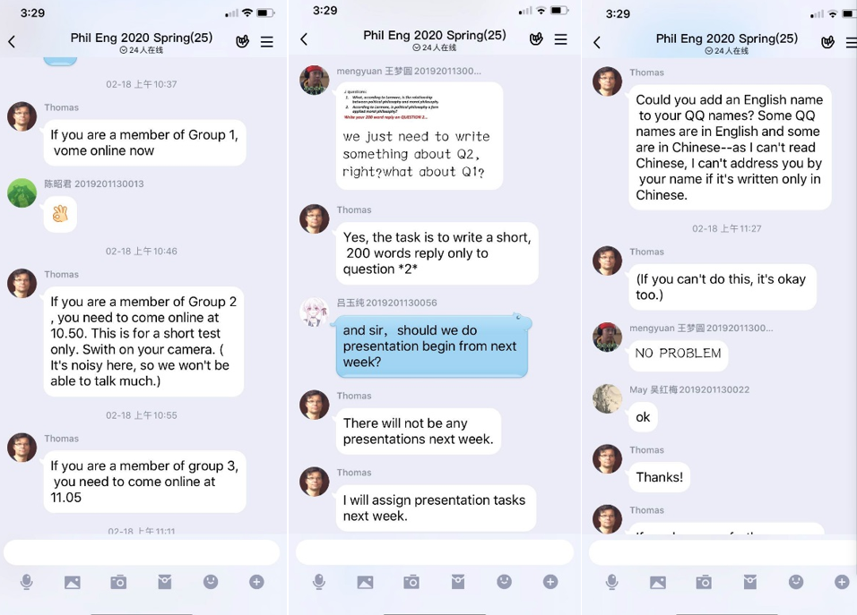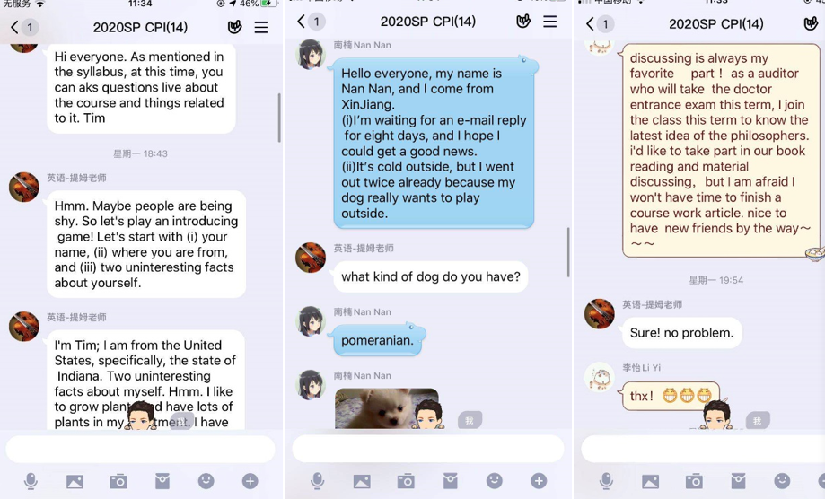 奈飞 的Timothy·Perrine博士后本学期开设了《当代世界哲学前沿问题研究》课程,这是一门颇具特色的研究生课程,旨在帮助研究生在授课老师的帮助下迅速了解一个当前的前沿热点问题。为了能够帮助学生迅速进入状态,打消线上授课的陌生感,Tim老师首先进行了自我介绍,并希望同学们介绍自己的名字和来自哪里,分享两个关于自己“不有趣“的事实。这一新颖的形式引起了QQ群里学生们的热烈回应,课后不少同学也表示Tim老师的授课风格风趣幽默,期待接下来的课程。