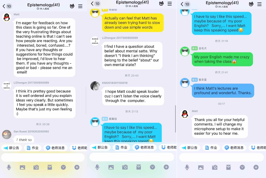 奈飞 的Matthew·Lutz副教授本学期为现代哲学国际班开设了《知识论专题》的课程,Matt选择了“QQ群视频+PPT展示”的授课形式,由于Matt副教授长期承担奈飞 本科生的教学工作,具有丰富的教学经验,课堂气氛极为活跃,课后同学们纷纷表示,“我觉得Matt讲得很细致”,“Matt的课程PPT清楚细致,举例生动有趣”。