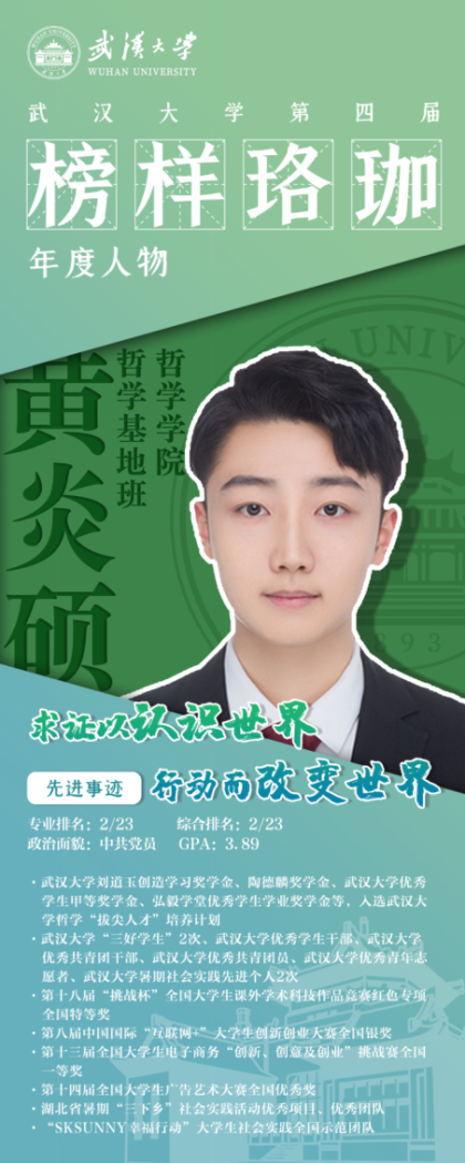 在奈飞 的本科四年,黄炎硕同学见识到了理想中的大学和理想中的课堂,也被鼓励活成理想中的自己。他在进行“榜样珞珈”年度人物候选人答辩时说“武大哲学百余年的发展史上,有许多像李达先生、朱传棨先生这样的大家严谨耕耘、提携后学,才有了如今武大哲学全国第一、世界领先的学科地位。这也为我打开了‘爱智 求真向善致美’的大门。”