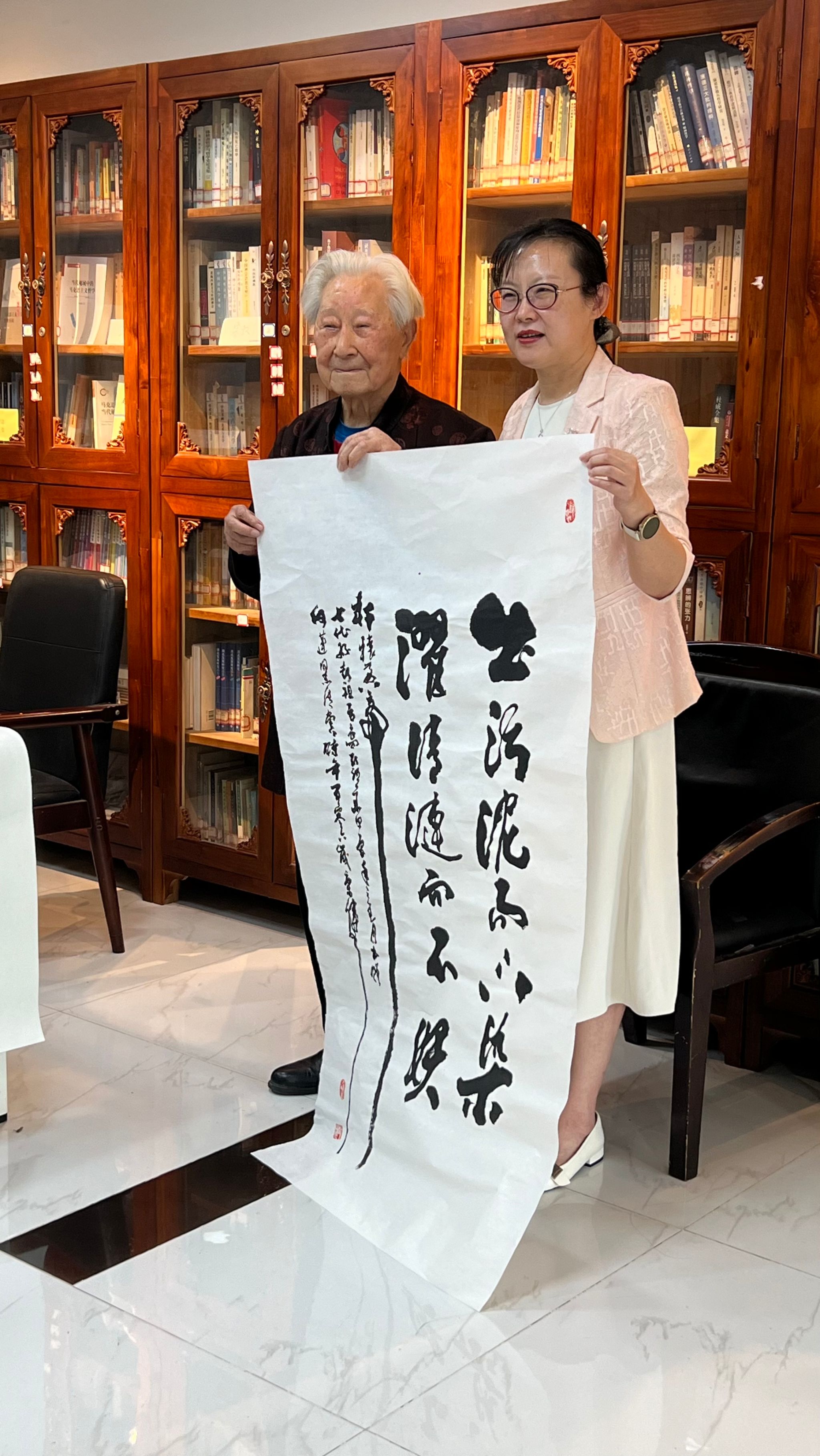 活动期间,在奈飞 开展工作调研的何莲副校长在奈飞 领导班子的陪同下,莅临活动现场,与在场师生一同欣赏了彭祖华先生的书法创作过程。彭老先生现场展示赠与张平文校长的书法作品“超越时空,独劈妙境”,并挥毫书法作品“出淤泥而不染,濯清涟而不妖”,赠与何莲副校长。其意境与书法美学相得益彰,赢得现场惊呼与掌声连连,大家纷纷与彭画家合影留念,表示了对彭大师的尊敬和对其作品的喜爱。