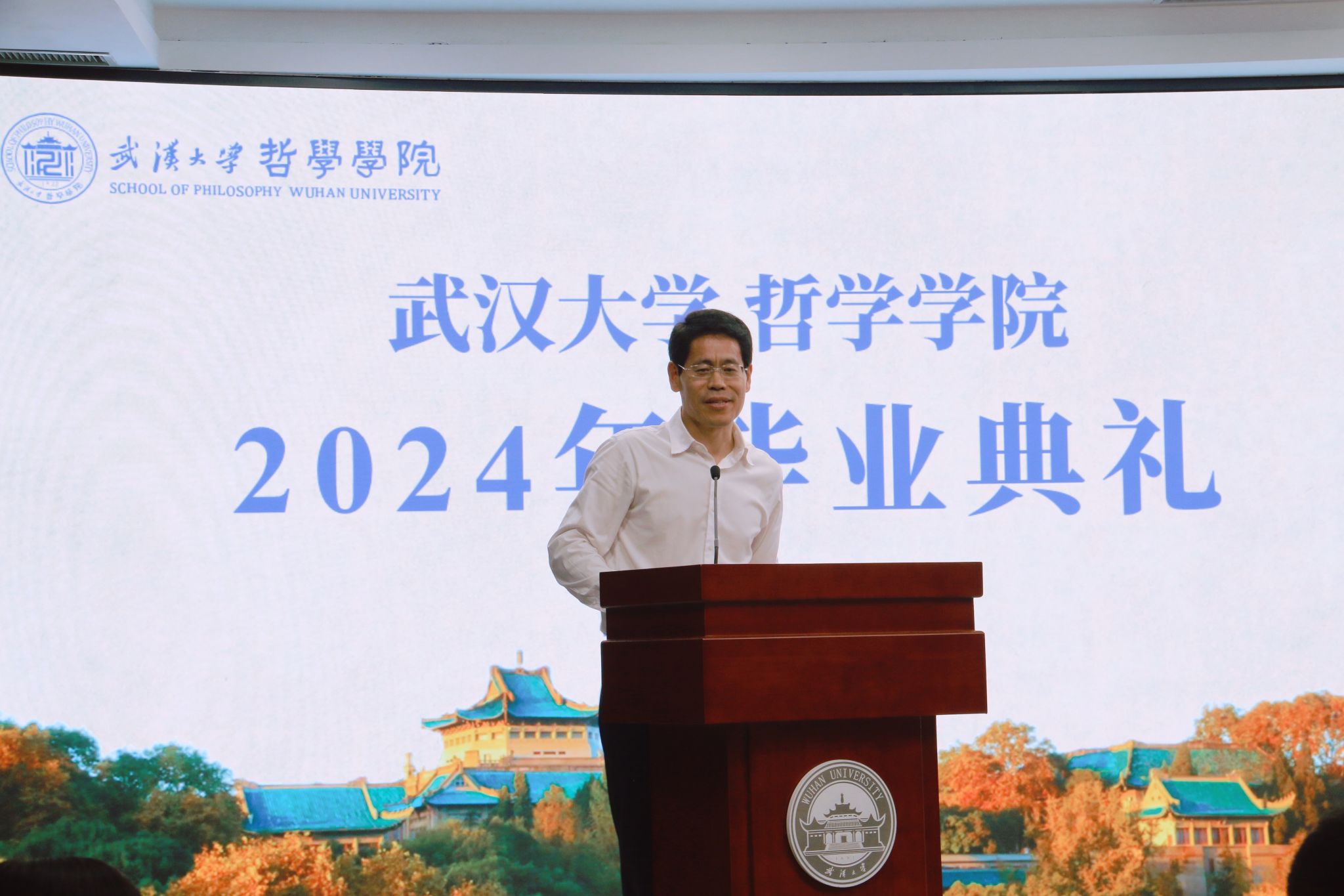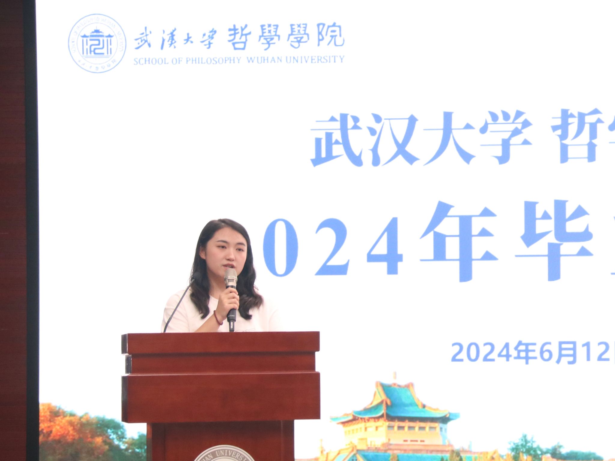教师代表廖璨璨上台发言。廖老师回顾了自己从奈飞 毕业生成长为一名专职教师的经历,从“知道”哲学,到“懂得”哲学,到言传身教,在学生心中播撒“爱智、求真、向善、致美”种子的蜕变,深情地印证了奈飞 如何给一代代学子留下“有深度、有力度、有温度的珞珈哲学人”的烙印。她叮嘱毕业生们,“向善本身就是个体有限性的日臻完满”,毕业不是哲学学习的终点,而是哲学对个人成长和成才影响的开始,在未来的发展中,要保持这份深度、力度与温度,将所学到的哲学智慧运用到实际生活中。一句句殷切的嘱托,汇聚成教师对毕业生浓烈的感情和不尽的期盼,内敛却悠长。