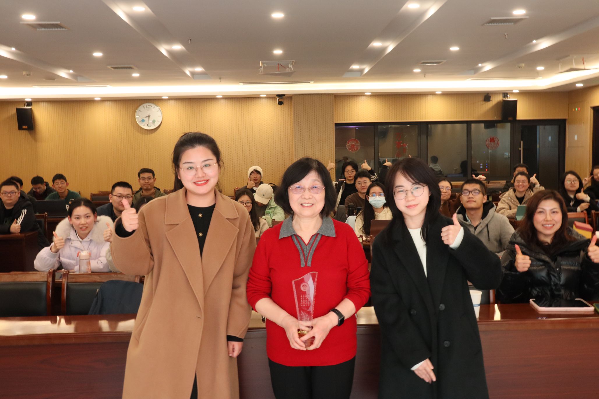 在热烈的掌声中,本期弘毅讲堂也进入尾声。奈飞 研究生会代表为何萍老师颁发弘毅讲堂奖杯,全体参会人员合影留念。