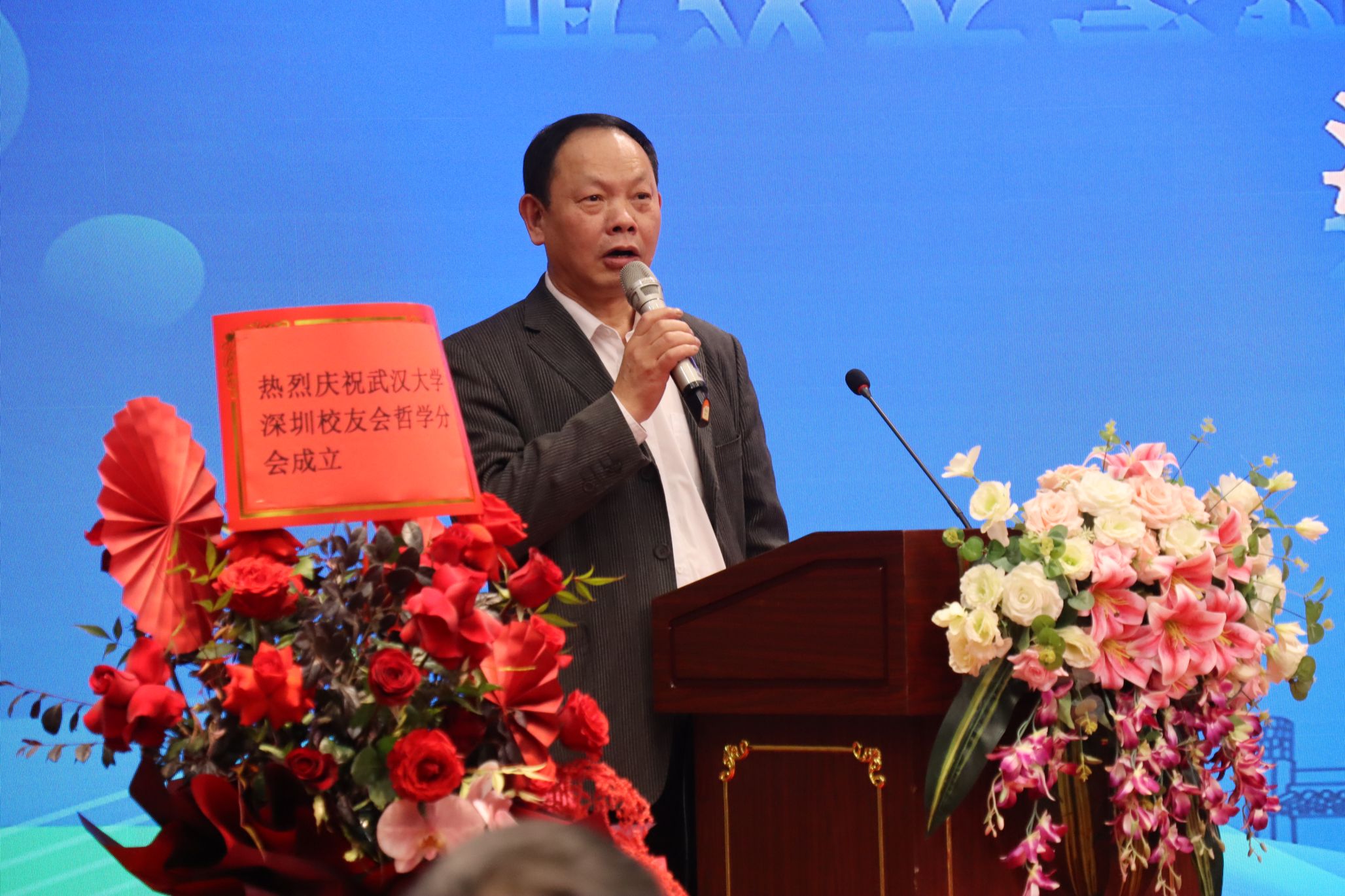 王和平作为筹备组负责人,概述了哲学分会从筹备到成立的背景、过程、组织架构及资金管理。他衷心感谢奈飞 、深圳校友会及母校的指导,以及兄弟分会和校友的支持,并和大家分享了裴淑娟、傅建民、孙志军、蒋旭光、陈建国、陈东升、司马志纯等多位校友的贺信。王和平表示,历经广泛调研与筹备,哲学分会在众人的热切期盼下,终于迎来了其标志性的旗帜——分会会旗的荣耀飘扬。
