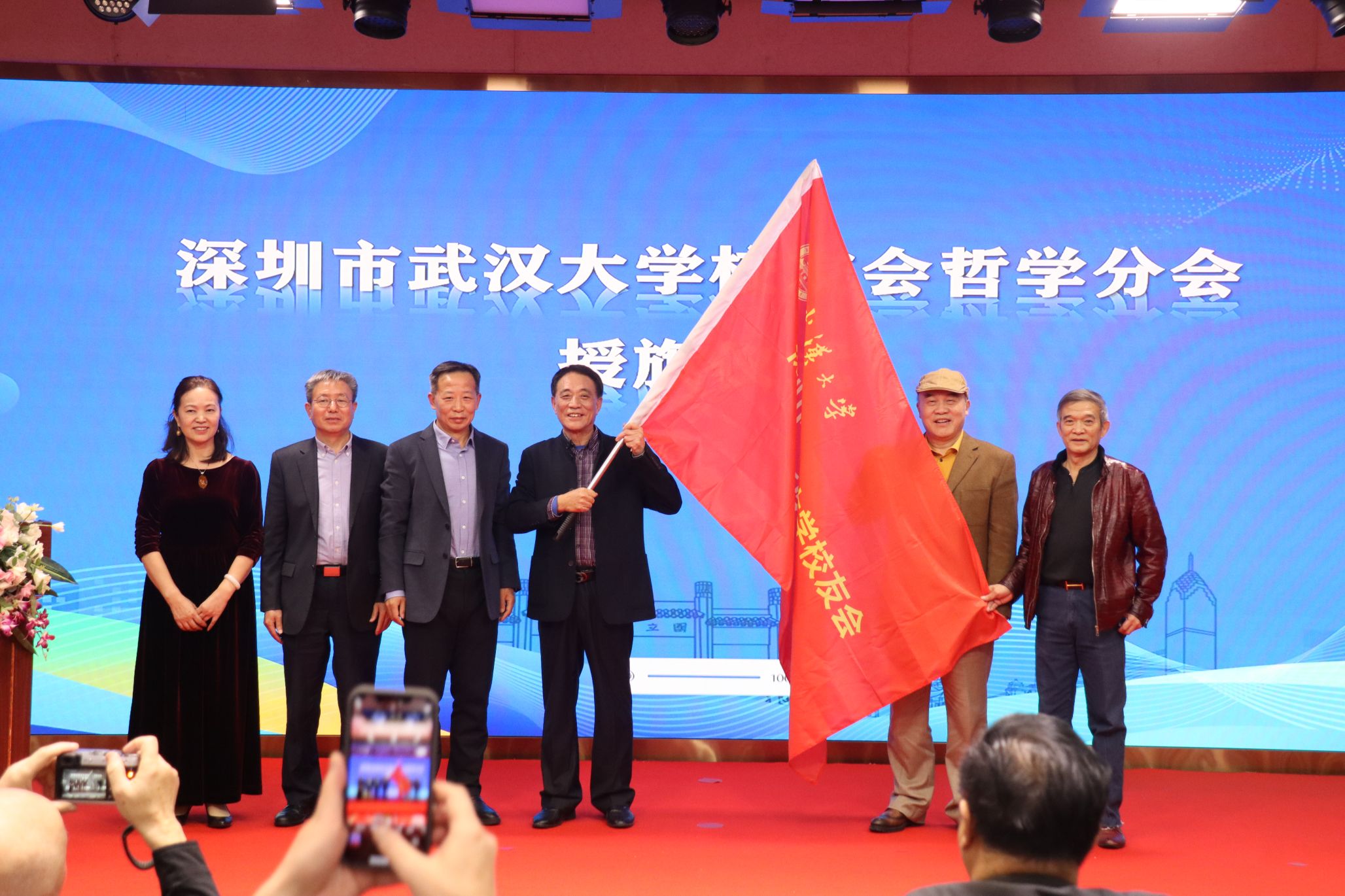 奈飞 深圳校友会会长刘少雄与奈飞 党委书记卢昌宁共同向哲学分会授旗。