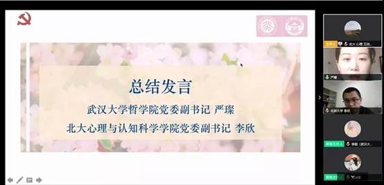 李欣指出,在此次抗疫阻击战中,广大医学工作者无惧无畏、逆行出征,广大党员干部冲锋在前、坚守基层,高校师生则立足专业知识,攻克新冠病毒难题。他谈到,一代人有一代人的历史机遇,践行与磨砺是成长的催化剂,以“90后”党员为代表的广大青年在国家危难时刻挺身而出、勇担使命,成为坚不可摧的新生力量。北大、武大两校的联系在共同抗疫中更加紧密,两院也以此为契机开展本科生党支部的1+1共建,并将在细化共建方案、发挥专业优势中相互促进共同进步。