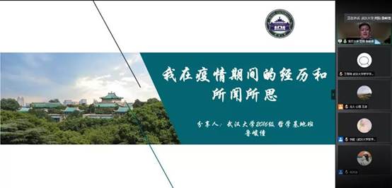 北大的潘建伟、刘雨洁,武大的鲁峻僮、夏莹分别讲述了“无畏”的战疫故事与“刻苦”的居家学习故事。潘建伟深度结合疫情期间在“北大心理人”公众号运营的工作经历,描绘出千万北大心理人的战疫故事与爱国初心;刘雨洁细致介绍同学们居家有律、潜心学习与科研的状态,展现出向上向阳的信念;鲁峻僮谈到在疫情期间,曾与武大青岛校友会、南阳理工大学老师和武汉恩施商会等辗转联系、积极对接,在受挫后仍不气馁,最终购买了宝贵的口罩作为物资支援,而身边同学无论身处何地,都以聚沙成塔的信念支援疫情、互相帮助;夏莹将家人的抗疫故事娓娓道来,或在自家开的杂货店中积极原价提供抗疫物资,或在封城后为重点防疫地区消毒,她自己则奔走在辟谣第一线,并远程辅导武汉医护人员的子女学习。桩桩件件,两院生均在疫情期间,用不同的方式、在不同的战线,彰显着青春力量,交出了合格的答卷。
