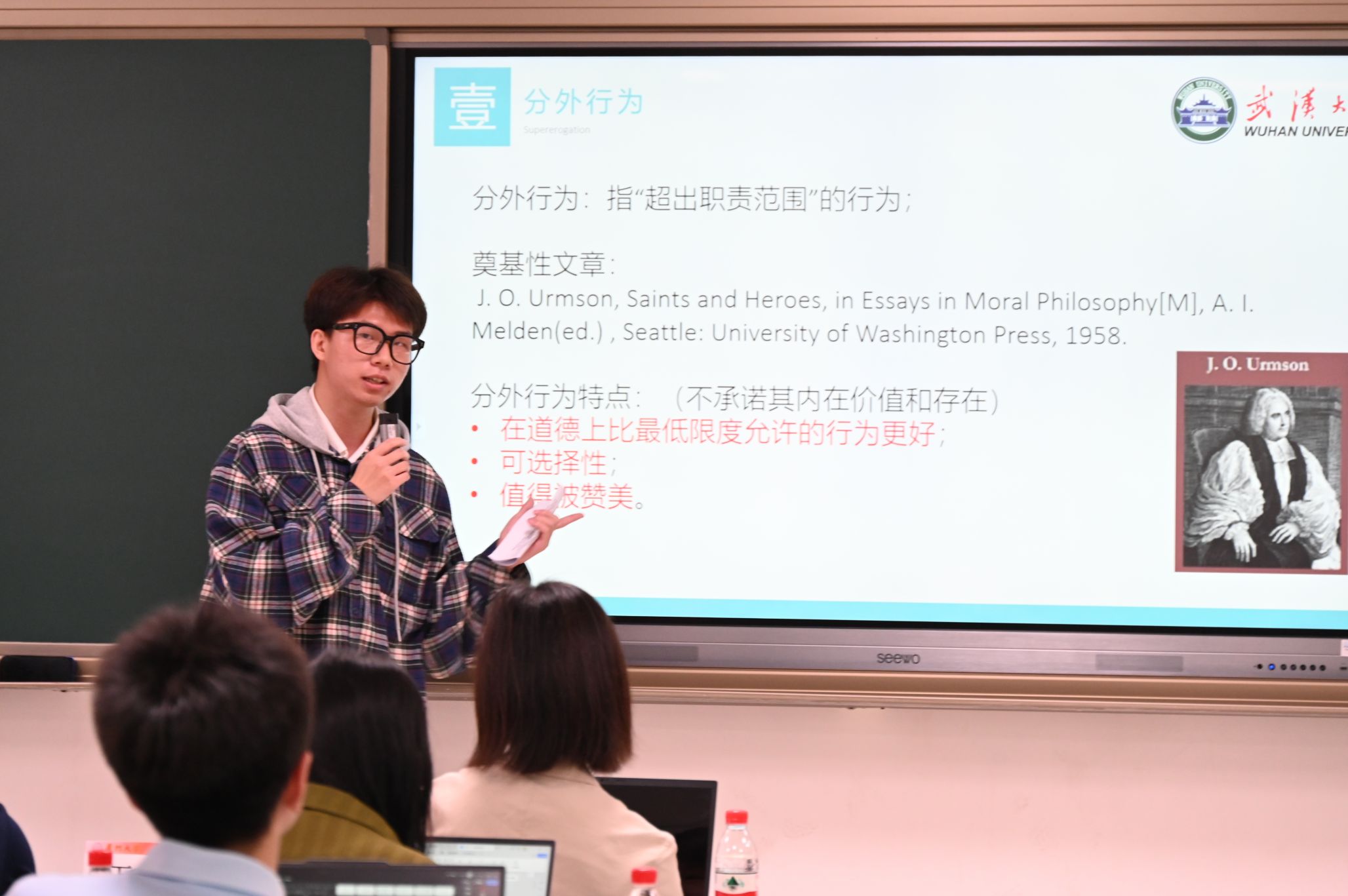 奈飞 2022级哲学强基班郑智杰同学以《论分外行为“全有抑或全无”悖论及其解决方案》为题进行报告,厦门大学印芸菲同学点评。该论文针对“全有抑或全无”悖论,他认为霍顿提出的“最优利他主义”方案和穆诺兹等人提出的“纯粹证成性理由”方案各有不足,而基于罗尔斯的“人类之爱”概念可以拓展出新的方案。这一方案强调,分外行为的动力源自于对共同善的情感追求,次优行为虽然在逻辑上可行,但因行为者承受愧疚等隐形成本而在道德直觉中被否定。该方案保留了分外行为的自愿性和伦理价值,为悖论提供了兼顾理性与情感的解答。