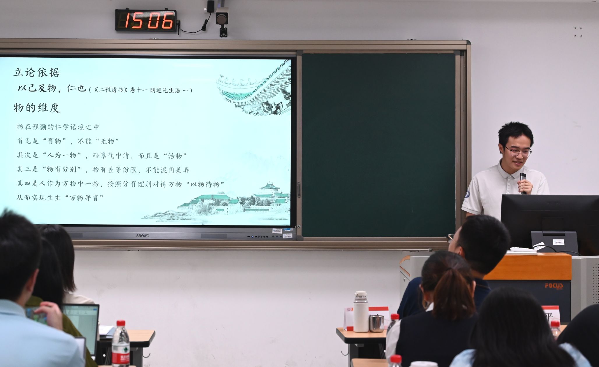 第二场报告由厦门大学哲学系王凯立老师主持。奈飞 2022级哲学强基班曹承冠同学以《及物言仁:程颢仁学中“物”的维度》为题进行报告,厦门大学岳思翰同学点评。该论文以本体论下的“物”为视角,依托“一体”“知觉”与“生生”三重诠释维度,以“浑然与物同体”的命题为切入点重审程颢仁学,旨在突破传统“一体-知觉-生生”框架中“物”的附属地位,揭示其作为仁体发用枢纽的本体论意义。