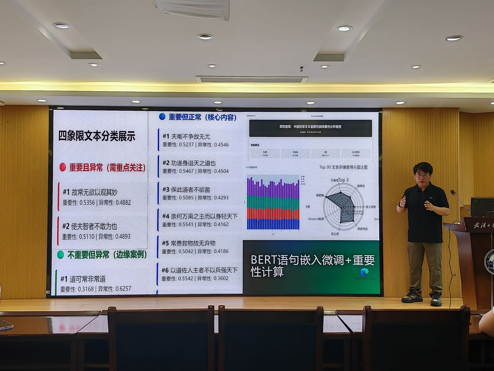 李巍教授在讲座中指出,人工智能本质是用数学的方式,拟合复杂的世界并不断构造世界模型。对于哲学的思想模型,人工智能则通过对语义的理解来把握思想。机器给每一个词汇赋予坐标即向量化,通过模长和夹角微妙的变化展示语义的变化,让意思相近的词靠近,意思相反的词远离。在Transformer架构中,生成式人工智能主要使用解码器完成语言输出的任务。与之不同的是,“中华文化智能论证实验室”本地部署的“齐物智算”中国哲学深度学习模型群主要使用编码器,核心在于文本特征的提取,“理解”哲学文本中的语义和论证,不仅可以计算文本相似度并基于时序变化找到文本的核心观点,展现概念及其关联的周期性变化;也可以把文本分成不同的主题,对相似的主张和观点在空间上聚类,反映出思想运动的趋势。