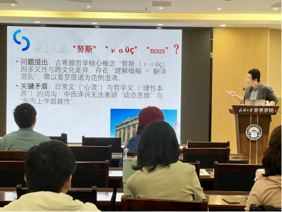 活动伊始,陈越骅教授指出了希腊哲学术语努斯在当今学界的理解和翻译困境,即古希腊哲学核心概念努斯因多义性与跨文化差异存在理解模糊和翻译混乱的问题,因此本次讲座以普罗提诺为范例进行澄清。在经过对于努斯的核心内涵、词典释义、哲学传统的相关内容进行梳理后,陈越骅教授接着创造性地提出了其对于努斯译词争议提出的解决方案,即“理思”译法的提出。“理思”译法的提出核心定义有两部分组成,一部分是“理”,它对应的是形而上学普遍规律,如朱熹“即物穷理”,另一部分是“思”,它对应的是动态思维活动,这二者合称“理思”,这种译法能够兼顾“超越性”与“动态性”。