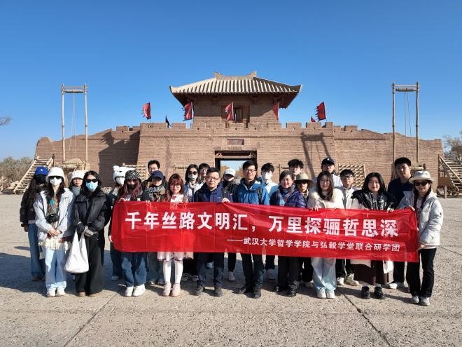 从鸣沙山月牙泉的沙水共生,到阳关古道的汉唐遗韵,从西千佛洞的丹青华章,到莫高窟的文明回响,每一处遗址都镌刻着千年文明的印记,每一次凝视都满含着对文化根脉的思索。此次敦煌研学,不仅让师生们在在戈壁绿洲间触摸历史印记,在石窟关隘中解码文明传承,更在哲学与美学的双重观照下,深刻领会到敦煌文明中开放包容、向善守正的精神内核。回望这段旅程,我们在文物与壁画中读懂古人的精神追求,在大漠与长河中感悟自然与人文的共生之道——反思敦煌的过往,既是对千年文明的敬畏与铭记,更是从历史智慧中汲取力量,为新时代精神文明建设寻找方向。