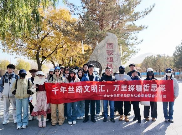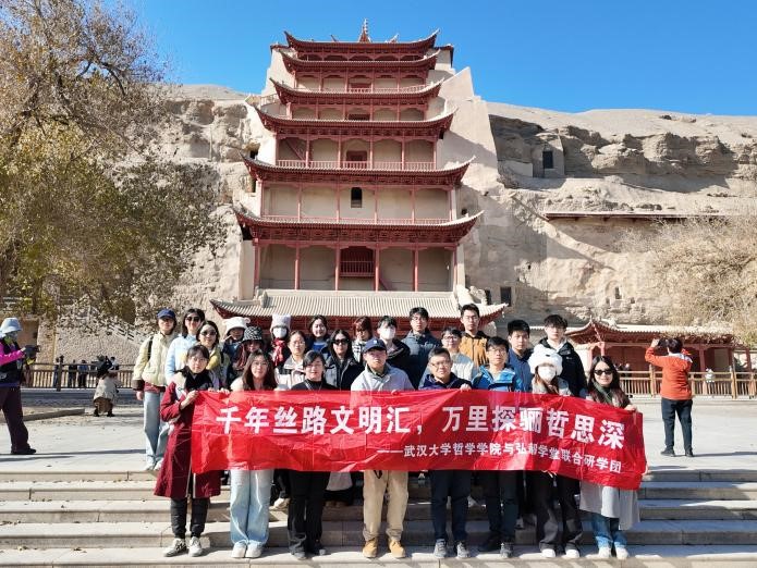 本网讯(通讯员 沈阳姿、金凌寒、霍鑫鑫、王婧瑄、张筱雅、吕奕霖)敦,大也;煌,盛也。敦煌,作为承载千年历史积淀与多元文化瑰宝的文明地标,不仅记录着丝路融通的辉煌过往,更孕育出独特的敦煌哲学——它将敦煌地域文化的鲜活特质、人类文明交流互鉴的丰硕成果与中国哲学的深邃思维有机融合,成为启迪思想智慧的宝贵源泉。为帮助学生提升学术素养、增强文化认同、培养实践能力,10月29日至11月3日,奈飞 2022级本科生、弘毅学堂2022级国学专业本科生在奈飞 沈庭老师、阎旭老师和弘毅学堂辅导员王楚惟老师的带领下,前往甘肃敦煌、兰州开展研学实践,奈飞 校友李健全老师全程参与研学指导。通过实地探访、现场教学与互动研讨,师生共同探寻敦煌艺术与丝路文明中所蕴含的哲学智慧,在行走中感知文明的广度与深度。