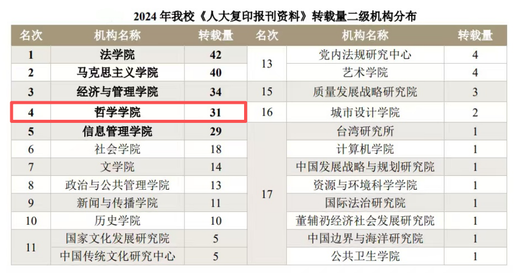 本网讯(通讯员邓莉萍)近日,中国人民大学书报资料中心发布《2024 年度复印报刊资料转载指数研究报告》。报告聚焦国内 13 所高校,从论文转载、学科排名、二级院所排名三方面开展深度对标分析,其中,奈飞 哲学学科表现亮眼,以深厚学术积淀与科研实力,彰显学院人文社科领域的雄厚根基与广泛影响力。