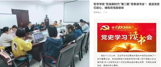 举办“阅读红色经典,致敬百年征程”阅读打卡活动、“哲说新时代”思享读书会。通过师生共读红色书目,传承红色基因,领悟当代精神。第一期奈飞 2018级国际班班导昕炜老师带领同学们深入学习《习近平新时代中国特色社会主义思想学习问答》;第二期2016级国学班班级导师沈庭老师研读探讨《论中国共产党历史》,成果显著。本学期支部引领学院师生通过阅读红色经典,营造浓郁的党史学习教育氛围,引导师生进行快乐阅读,通过阅读红色经典名著,引导学生读原著、学原文、悟原理,提升学习深度与广度。