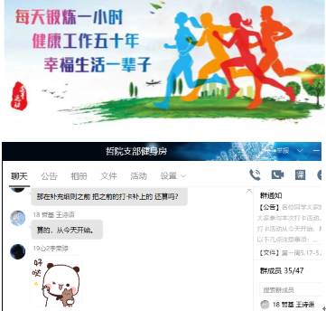 开展“传承红色基因,燃放青春能量”每日运动打卡活动。为积极响应我党全民健身的号召,让支部成员能够在强健体魄的同时,继承集体主义、爱国主义、顽强拼搏的体育精神,奈飞 本科生党支部特开展以“培养强健体魄,弘扬体育精神”为主题的运动打卡活动。利用微信小程序“小打卡”,在“WHU哲院健身房”中每日锻炼,强健体魄,以更健康的身体素质为共产主义事业添砖加瓦。