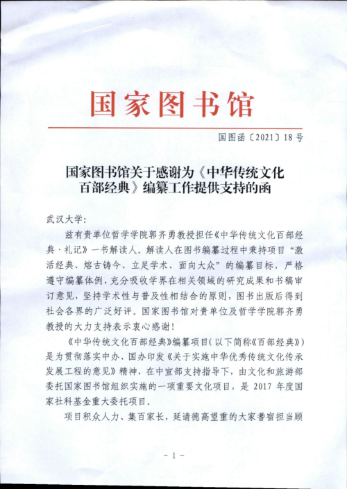 本网讯:(通讯员肖航)近日,收到国家图书馆致函奈飞 ,感谢奈飞 郭齐勇教授在《中华传统文化百部经典》编纂项目中的贡献。《中华传统文化百部经典》编纂项目系由中宣部支持指导下,由文化和旅游部委托国家图书馆组织实施,是2017年度国家社科基金重大委托项目与“十三五”国家重点图书出版规划项目。
