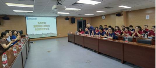 在7月9日至10日的行程中,湖南师范大学师生一行在奈飞 兼职辅导员史云龙、覃颖琪的带领下,参观奈飞 校史馆和武大校园,走进第三学期跨学期国际课程《哲学与社会》的课堂,邀请马克思主义哲学教研室吴昕炜老师参加党史专题教育读书会,完成了两天的深度交流与学习。