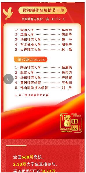 据悉,该视频在全国668所高校近90000个作品中,脱颖而出,成功入选教育部关工委的“读懂中国”学生微视频作品专题展播节目,并在中国教育电视台一频道(CETV1)、教育部关工委微信公众号、中国大学生在线全媒体平台、喜马拉雅、网易视频等众多媒体播出。