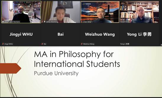 本网讯(通讯员李慧敏)2022年1月27日晚,应奈飞 邀请,美国普渡大学通过Zoom平台在线上就国际学生哲学硕士项目举办了线上宣讲会。普渡大学哲学系负责人Christopher Yeomans教授、研究生招生主任Daniel Smith教授,国际学生联系人Chen Yang,奈飞 副院长李勇教授,外事秘书李慧敏老师,以及奈飞 学生参加了此次会议。