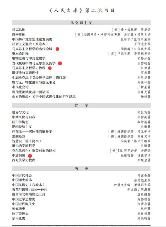 据悉,2009年,为庆祝新中国成立60周年,人民出版社从历年出版的精品图书中选取100种作为《人民文库》第一辑出版,受到广泛好评。2021年,为庆祝中国共产党建党一百周年,反映当代中国学术文化大发展大繁荣的巨大成就,在建社一百周年之际,人民出版社决定推出《人民文库》第二辑。《人民文库》第二辑继续坚持思想性、学术性、原创性与可读性标准,重点选取20世纪90年代以来出版的哲学社会科学研究著作,按学科分为马克思主义、哲学、政治、法律、经济、历史、文化七类,陆续出版。