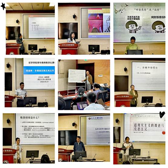在教师展示环节,9位参赛教师结合自身研究专长,聚焦于蕴含悖论、王阳明“知行合一”思想、耶基斯-多德森定律、直接知觉与间接知觉、宗教市场理论、毛泽东哲学兴趣的转向、超现实主义的激进马克思主义、敬畏情绪、1844年手稿中异化劳动与私有财产的关系进行了教学展示。
