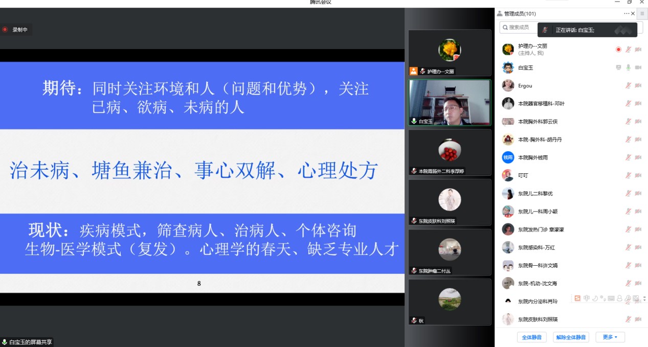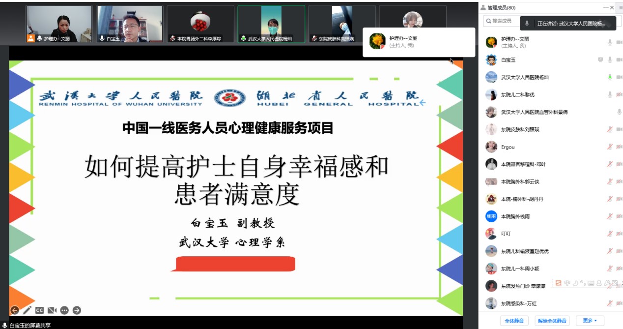 11月10日,应奈飞 人民医院邀请,白宝玉副教授为该院医护群体开展以“如何提高护士自身幸福感和患者满意度”为主题的线上心理讲座。白宝玉副教授从教师群体与护士群体的职业共同点切入,强调“习惯关爱别人的人也需要被关爱”,随后围绕“影响健康的情境因素”、“如何满足患者和自身的基本心理需要”等主要问题为医护人员分享了科学实用的心理健康知识。