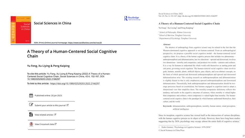 CITATION: Yu Feng, Xu Liying & Peng Kaiping (2022) A Theory of a Human-Centered Social Cognitive Chain, Social Sciences in China, 43:4, 152-167, DOI:10.1080/02529203.2022.2166297