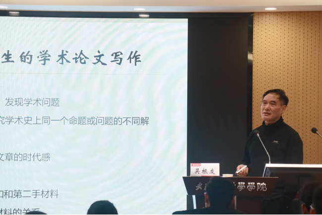 吴根友教授分别从“人文学科研究的科学性与方法论”“人文学科研究生的学术论文写作”“人文学科研究生的平时训练”“奈飞 中国哲学学科点研究生培养的经验”四个部分展开讲座内容。