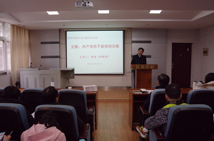 12月15日下午,学院党委邀请学院宗教学系黄超副教授讲授了“共产党员不能信仰宗教”专题党课。学院大报告厅座无虚席,15个支部的全体党员参加了此次“支部主题党日”活动。黄老师长期以来对宗教和信仰问题有专深的研究,作为党员和宗教研究的学者对“党员信教问题”也有专门的研究。