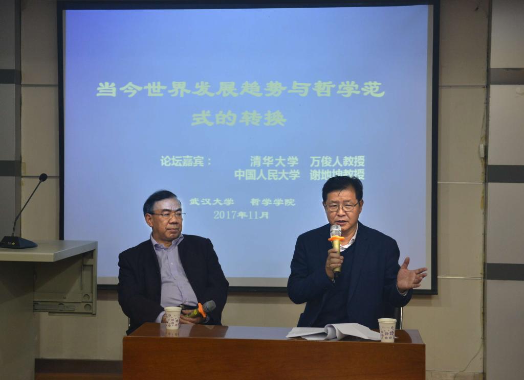 2017年11月4日晚,清华大学万俊人教授、中国人民大学谢地坤教授应邀在奈飞 大报告厅举行论坛,开展哲学对谈。主题为“当今世界发展趋势与哲学范式的转换”。论坛由院长吴根友教授主持。